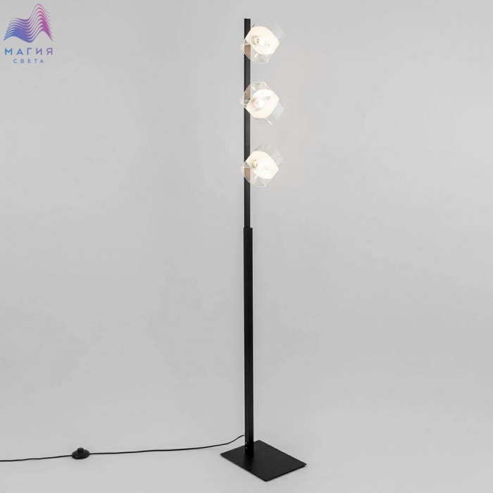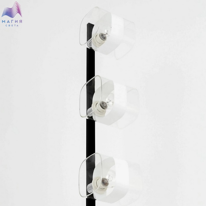 Торшер в современном стиле Citilux Вирта CL139932. Основание - металл, цвет - черный/хром. Модель с тремя плафонами, изготовленными из прозрачного стекла с декоративной белой полосой.