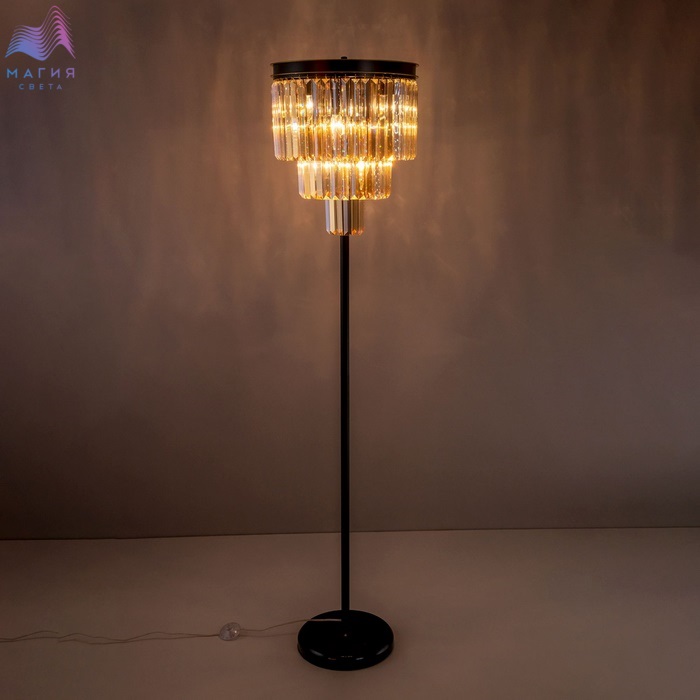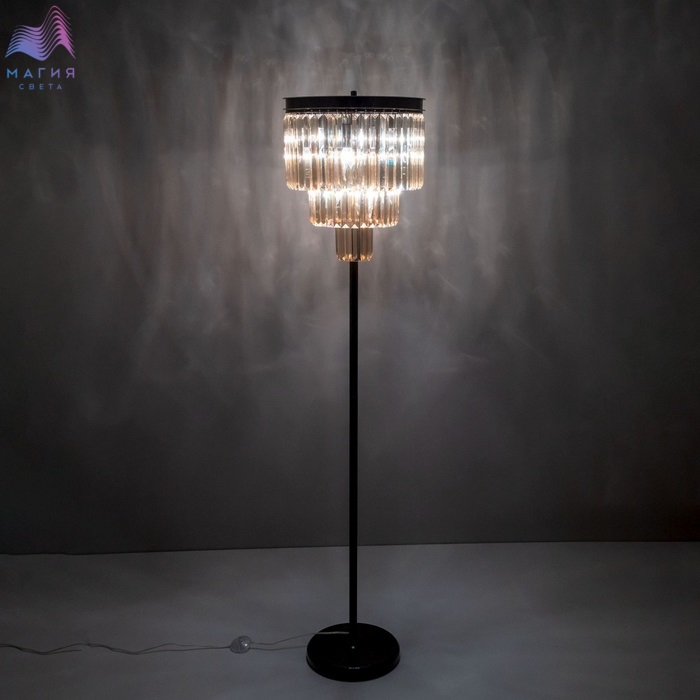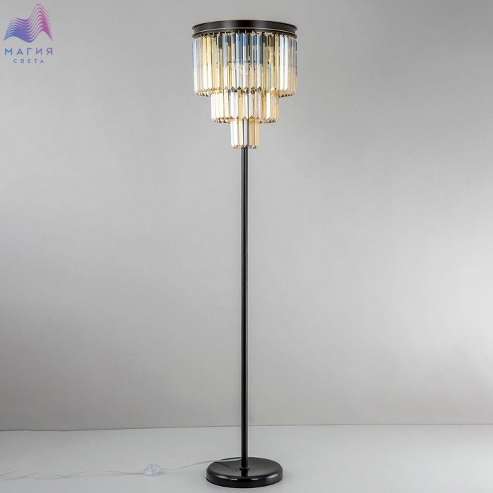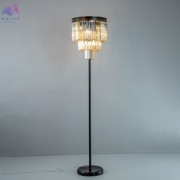 Торшер Citilux Мартин CL332992 с хрустальными подвесками модного оттенка шампань, расположенными каскадом в три ряда. Круглая верхняя часть модели и стойка выполнена из металла солидной толщины, окрашенного в темный коричневый цвет. Основание из натурального камня черного цвета. Высота изделия 1,7 метра.