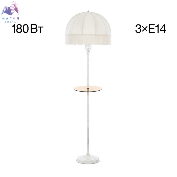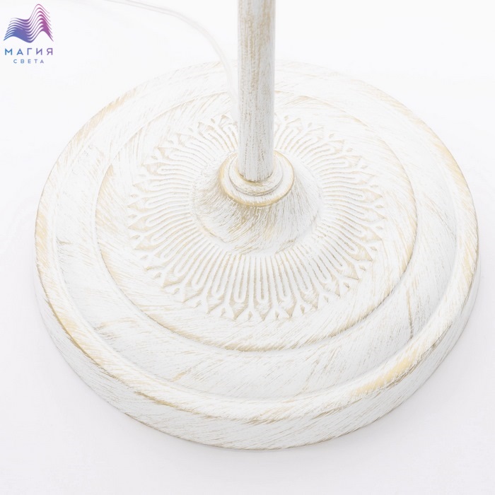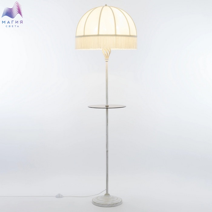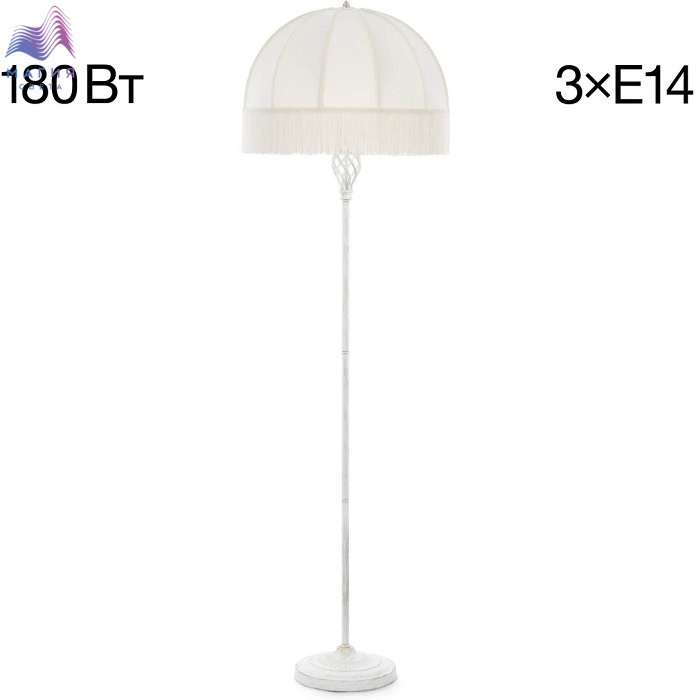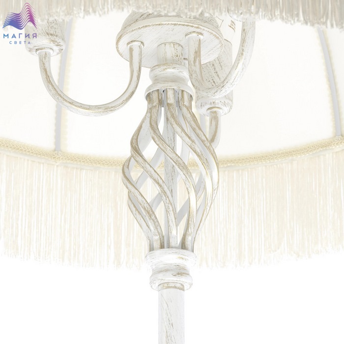 Торшер Citilux Базель CL407921. Материал: металл/текстиль. Цвет: белый с золотом/бежевый. Абажур из гладкой ткани нежно молочного цвета декорирован ажурной тесьмой и обшит бахромой. Сетевой шнур длиной 2м с напольным выключателем.