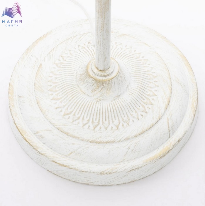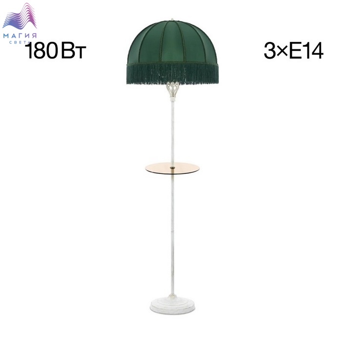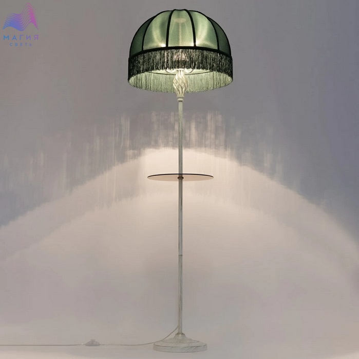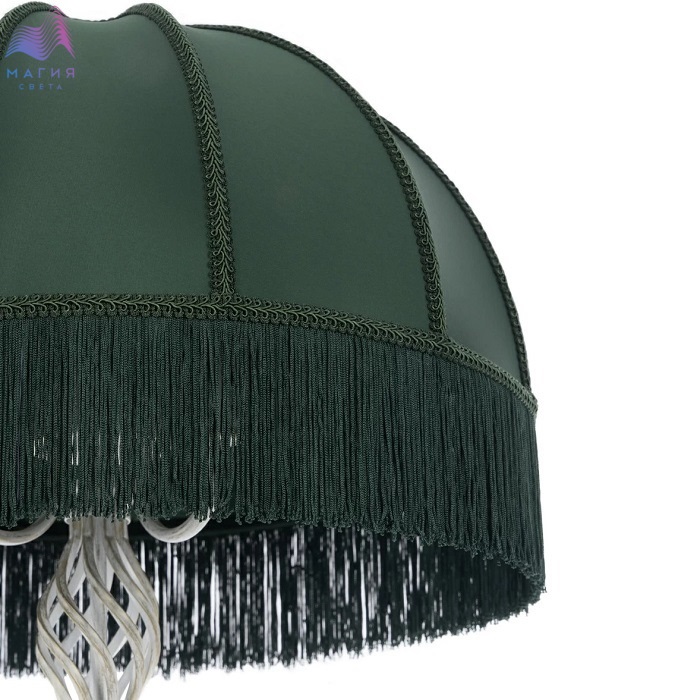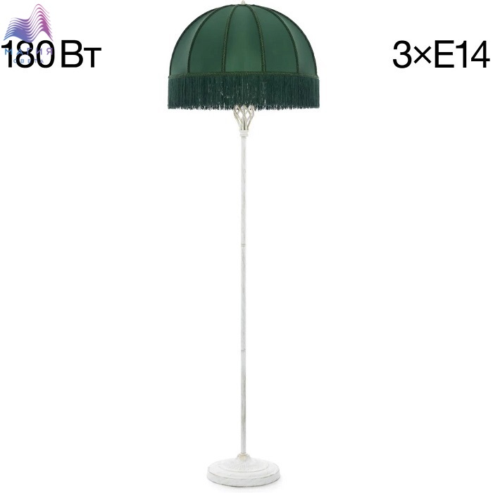 Торшер Citilux Базель CL407922. Материал: металл/текстиль. Цвет: белый с золотом/зеленый. Абажур из гладкой зелёной ткани декорирован ажурной тесьмой и обшит бахромой. Сетевой шнур длиной 2м с напольным выключателем.