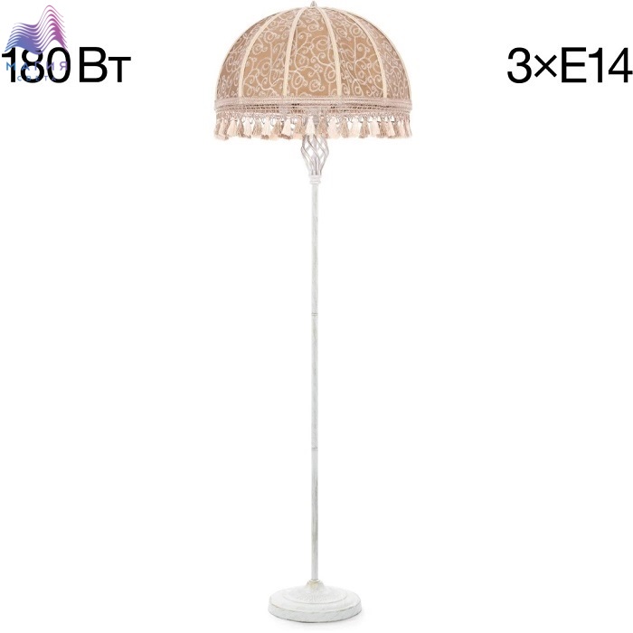 Торшер Citilux Базель CL407925. Материал: металл/текстиль. Цвет: белый с золотом/кремовый. Абажур тканевый цвета капучино, декорирован оригинальной вышивкой и обшит бахромой. Сетевой шнур длиной 2м с напольным выключателем.