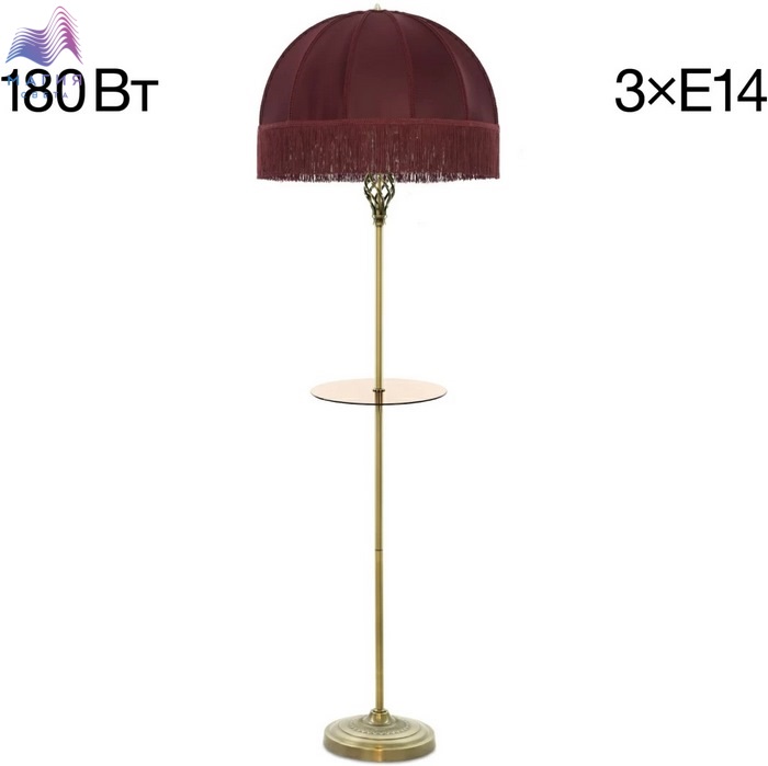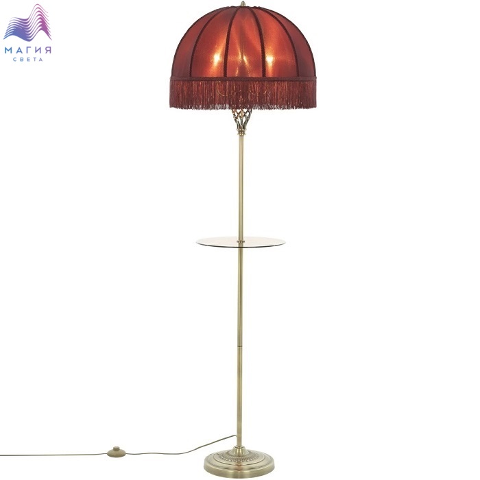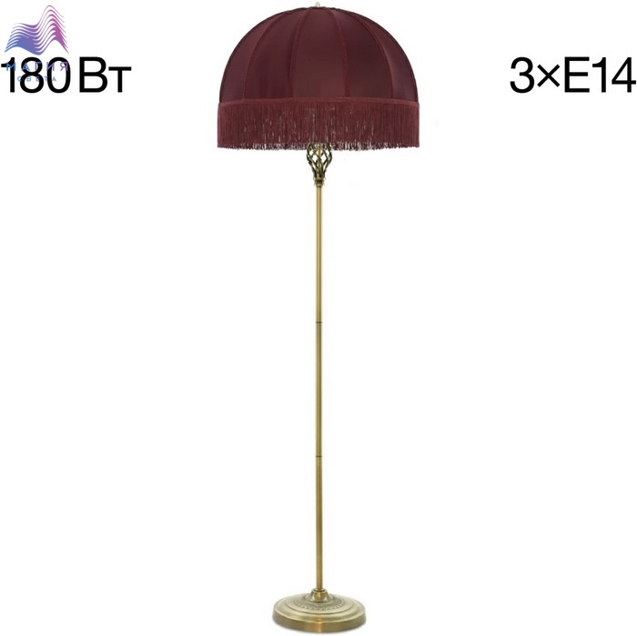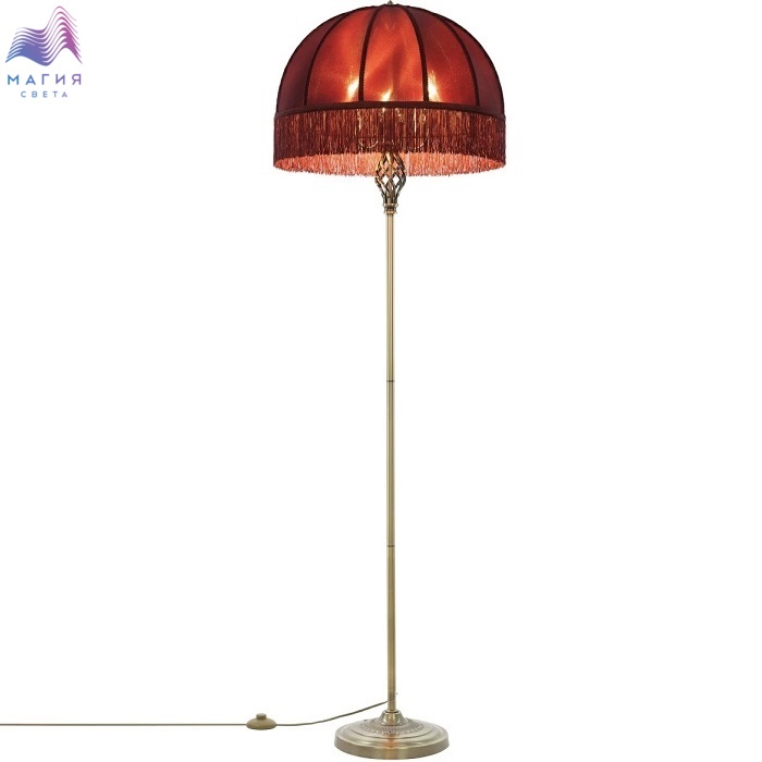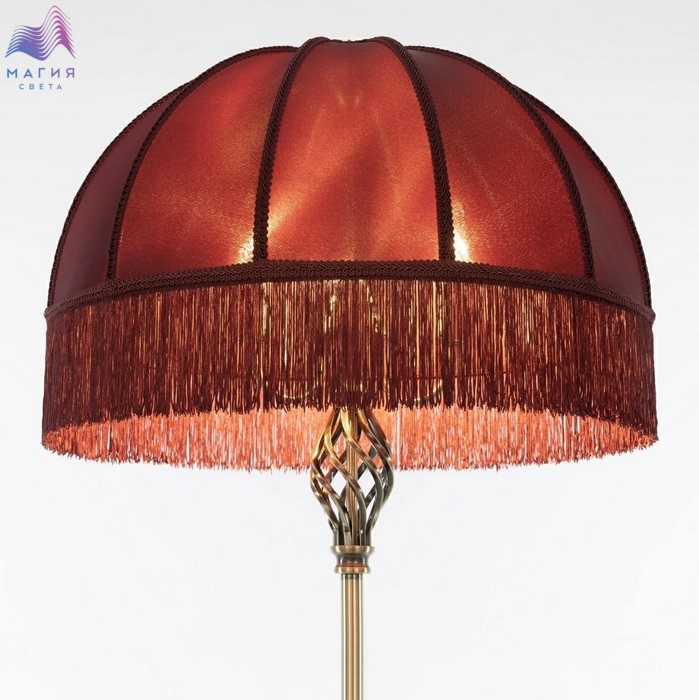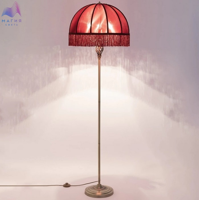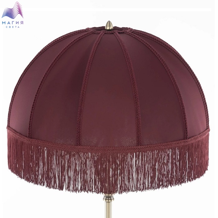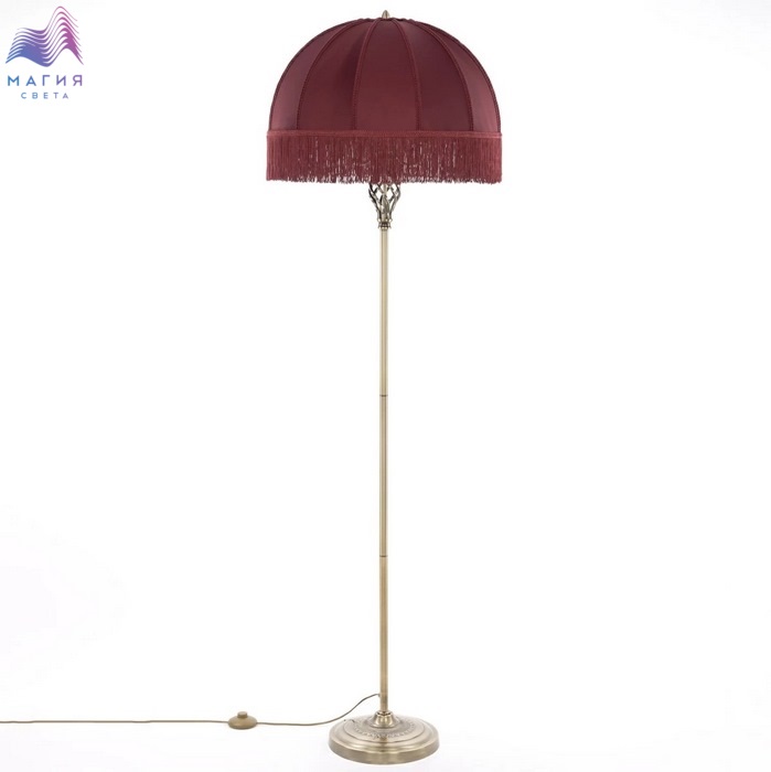 Торшер Citilux Базель CL407933. Материал: металл/текстиль. Цвет: бронза/красный. Абажур из гладкой тёмно-вишнёвой ткани декорирован ажурной тесьмой и обшит бахромой. Сетевой шнур длиной 2м с напольным выключателем.