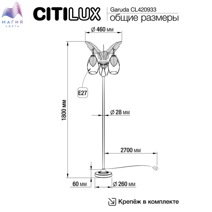 Торшер Citilux Garuda CL420933. Материал: металл/стекло. Цвет: бронза/шампань. Выключатель находится на шнуре питания (длина шнура 2 м).