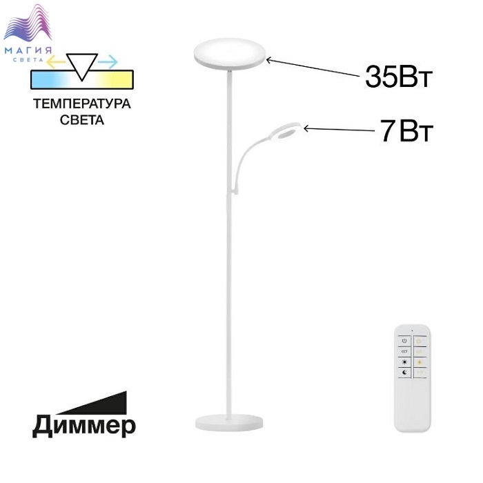Торшер Citilux Click CL810010 с сенсорным управлением выполнен в современном стиле. Материал: металл/пластмасса. Цвет: белый. Верхний плафон поворотный, для общего освещения, мощность 35Вт. Нижний плафон для чтения, на гибкой ножке, мощность 7Вт. Пульт ДУ также включен в комплект.