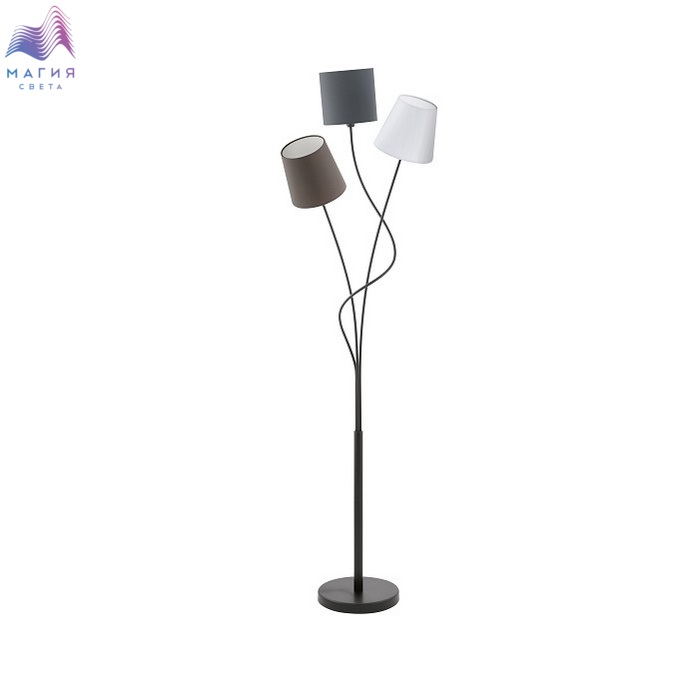 Оригинальный торшер Eglo Maronda привлекает внимание благодаря плафонам. Данная модель оснащена тремя текстильными абажурами следующих цветов: антрацит, белый, коричневый. Абажуры разной формы. Металлическое основание окрашено в черный цвет.