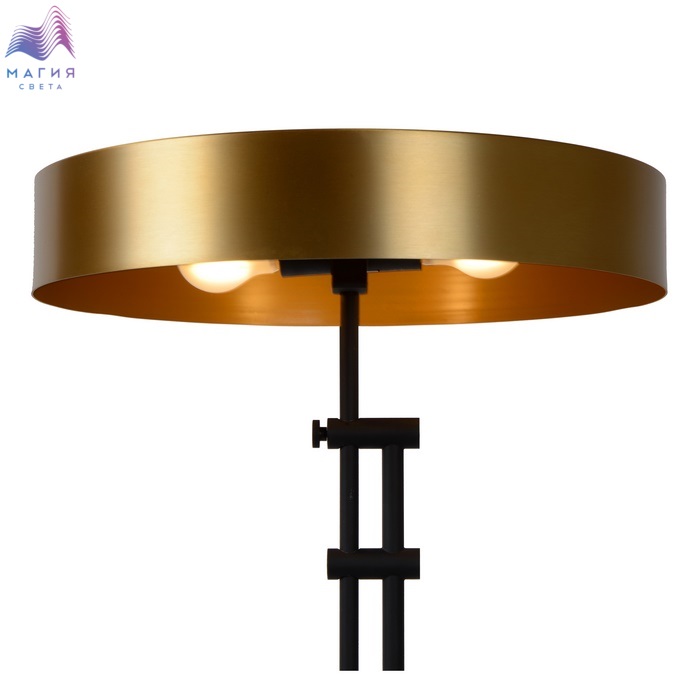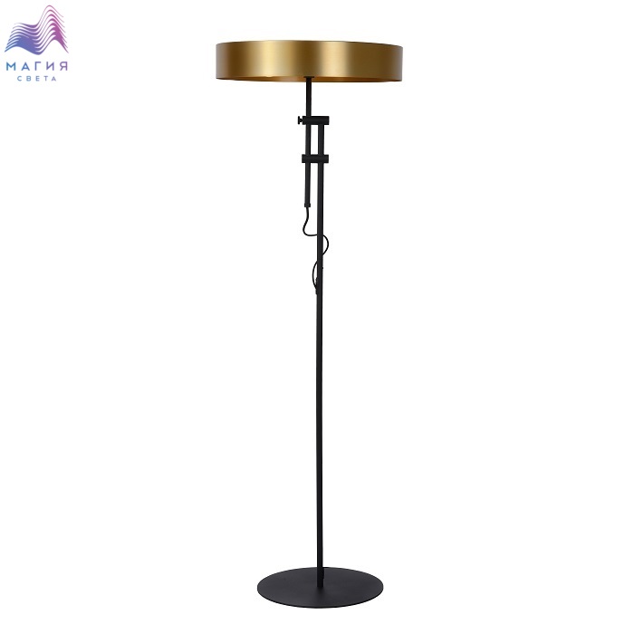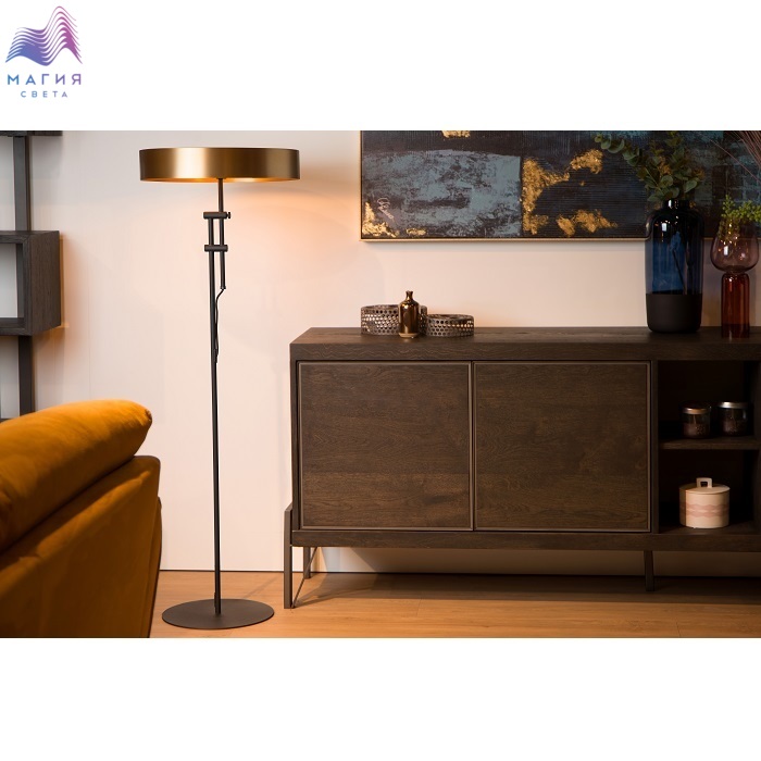 Торшер Lucide Giada элегантный и стильный. Металлический абажур поддерживается длинной трубкой и тонким стальным основанием. Светильник имеет высоту 143,5 сантиметра, а золотая рамка источника света имеет диаметр 45 сантиметров.