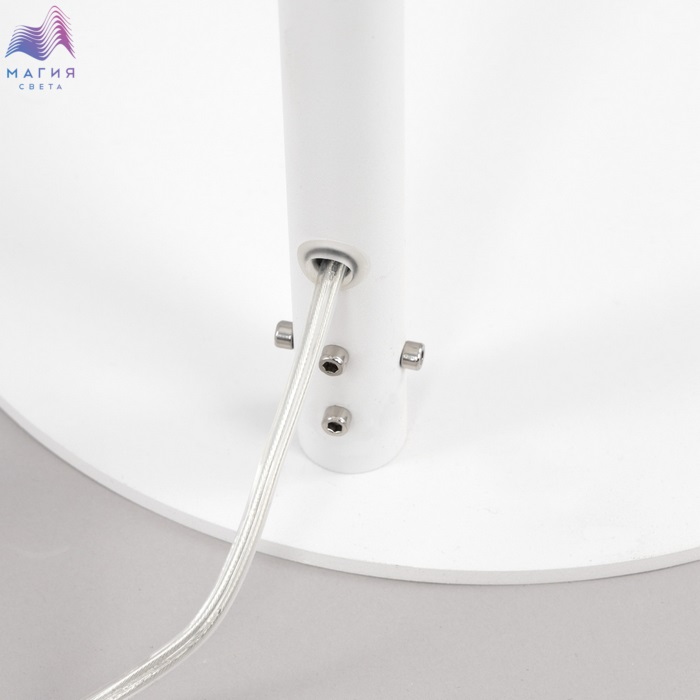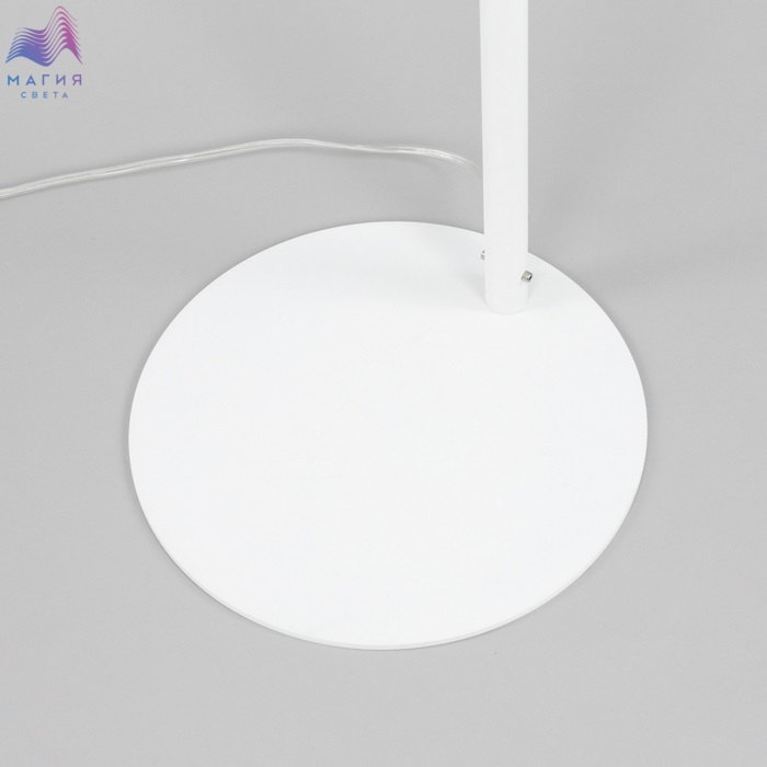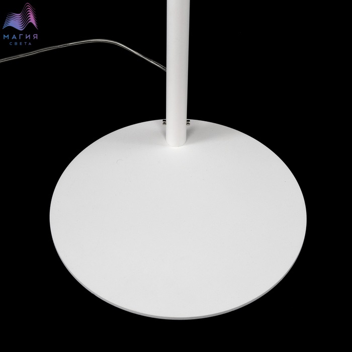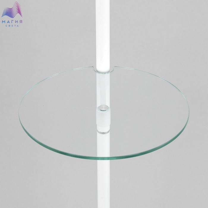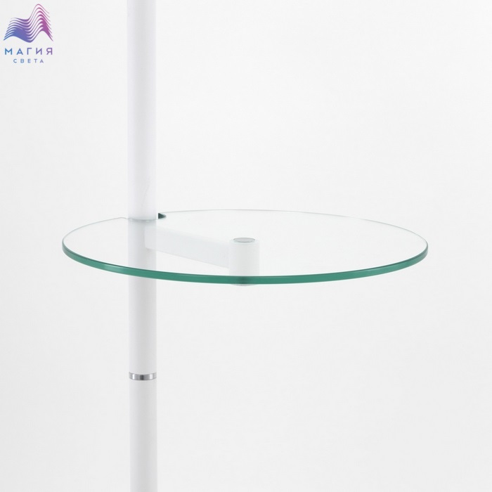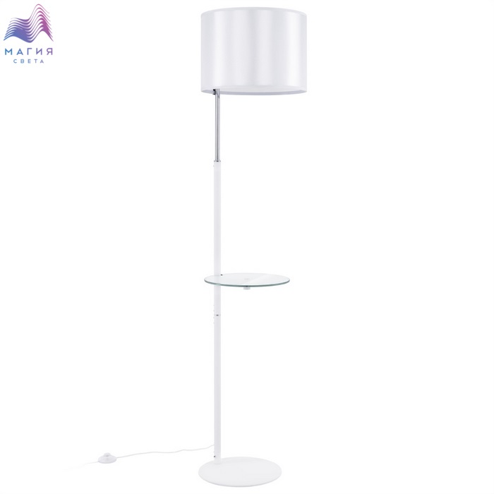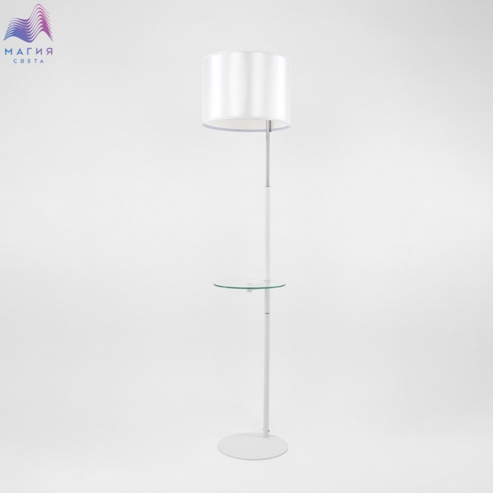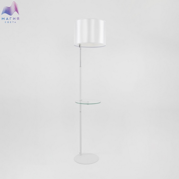 Торшер со столиком Citilux Батлер CL806010. Материал: металл/текстиль. Цвет: хром/белый. Абажур цилиндрической формы изготовлен из белой атласной ткани на подложке из оптического полимера. Столик круглой формы из прозрачного стекла.