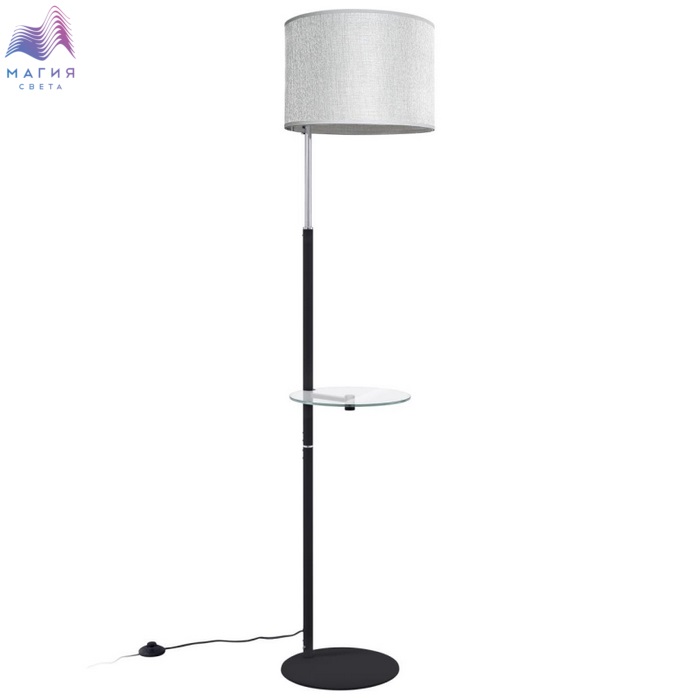 Торшер со столиком Citilux Батлер CL806011. Материал: металл/текстиль. Цвет: хром/матовый черный/дымчатый. Абажур цилиндрической формы изготовлен из серой текстурной ткани на подложке из оптического полимера. Столик круглой формы из прозрачного стекла.