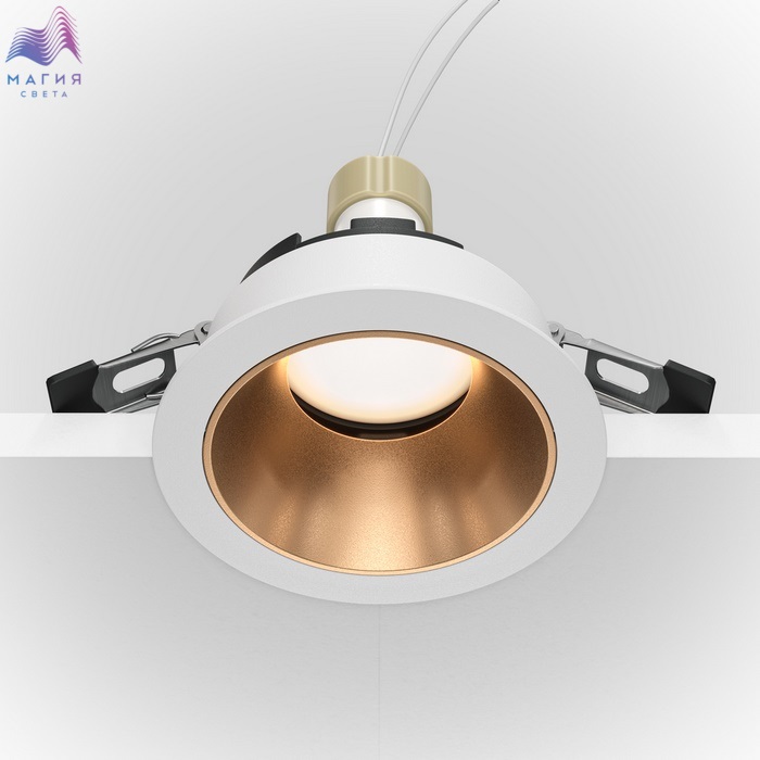 Встраиваемый светильник Maytoni Share рассчитан на использование светодиодной лампочки GU10 мощностью 10 Вт. Корпус выполнен из металла, цвет покрытия - белый/матовое золото.