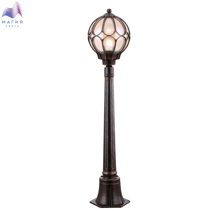 Серия уличных светильников Maytoni Via исполнена в классическом стиле. Примечательной деталью этой коллекции стал янтарный плафон в форме шара. Металлический каркас окрашен в цвет "золото антик".