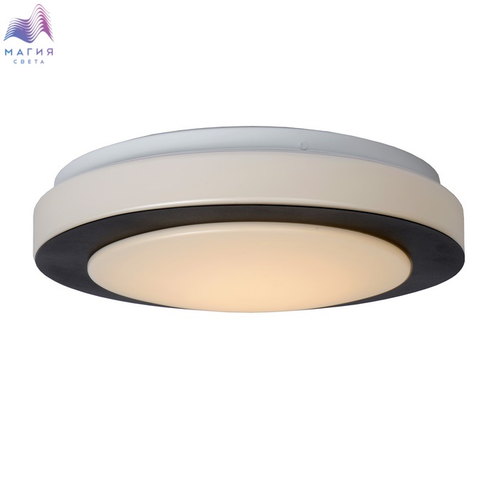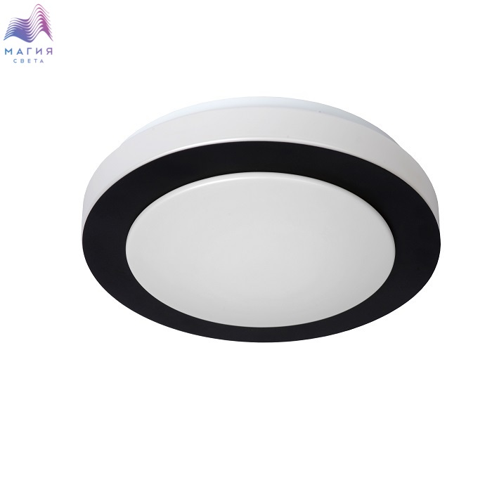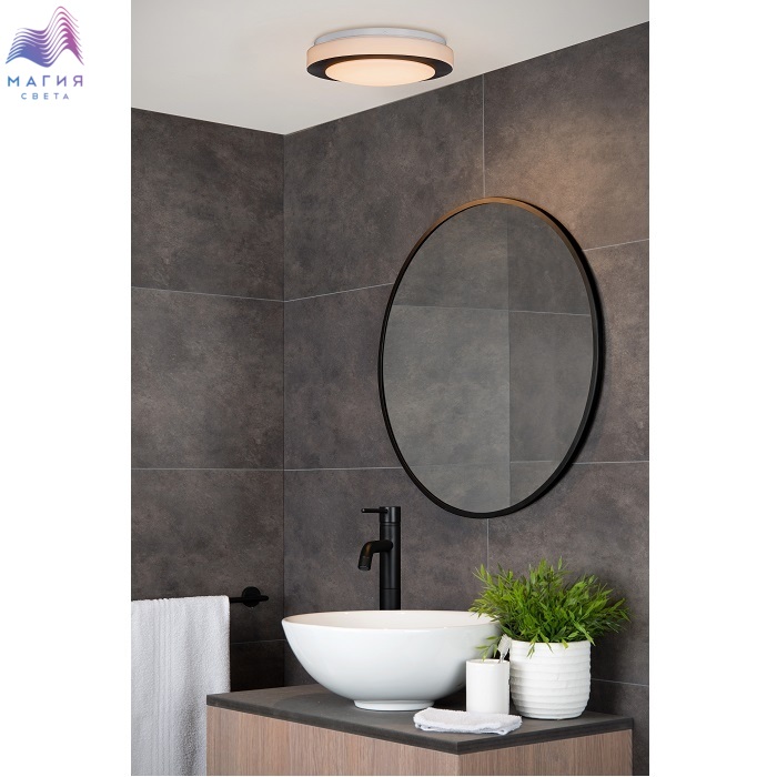 Уютный свет для ванной комнаты способен создать потолочный светильник Lucide Dimy. Эта модель отличается красивым и органичным дизайном. Черный металлический обод обрамляет пластиковый плафон. В качестве источника света используются светодиоды теплого белого цвета.