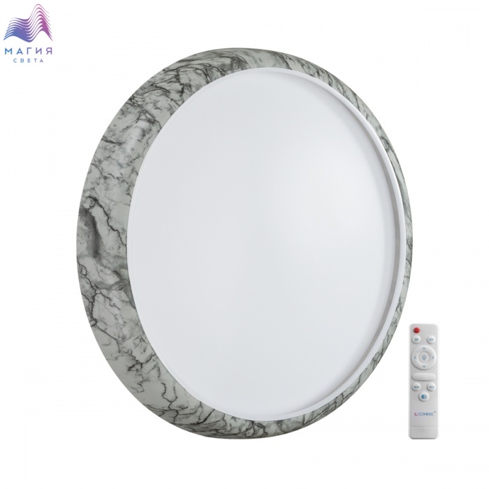 Светильник 7638/EL серии Сонекс Mramo white состоит из металлического основания и пластикового рассеивателя. Основание декорировано ободом "под мрамор" из пластика белого и черного цветов. Степень защиты IP43 позволяет использовать светильник в определенных зонах влажных помещений. В комплект входит заменяемый LED модуль с линзами, мощностью 70 Вт, которая соответствует лампе накаливания 610 Вт. А также пульт ДУ, с помощью которого осуществляется плавное изменение цветовой температуры 3000-6000К, изменение яркости, переход в режим переключения теплого/белого/холодного/ночного света. Светильник имеет функцию "память".