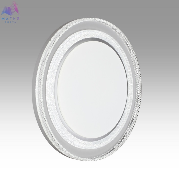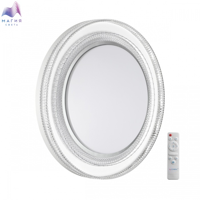 Светильник 7642/EL серии Сонекс Suzy silver состоит из металлического основания и пластикового рассеивателя. Основание декорировано ободом "под хрусталь" из пластика прозрачного цвета. Обод украшен пластиковым кантом, цвет серебро. Степень защиты IP43 позволяет использовать светильник в определенных зонах влажных помещений. В комплект входит заменяемый LED модуль с линзами, мощностью 70 Вт, которая соответствует лампе накаливания 610 Вт. А также пульт ДУ, с помощью которого осуществляется плавное изменение цветовой температуры 3000-6000К, изменение яркости, переход в режим переключения теплого/белого/холодного/ночного света. Светильник имеет функцию "память".