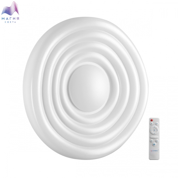 Светильник 7679/EL серии Сонекс Fass состоит из металлического основания и пластикового рассеивателя. Основание декорировано рельефом из пластика в виде узора белого цвета. Степень защиты IP43 позволяет использовать светильник в определенных зонах влажных помещений. В комплект входит заменяемый LED модуль с линзами, мощностью 70 Вт, которая соответствует лампе накаливания 610 Вт. А также пульт ДУ, с помощью которого осуществляется плавное изменение цветовой температуры 3000-6000К, изменение яркости, переход в режим переключения теплого/белого/холодного/ночного света. Светильник имеет функцию "память".