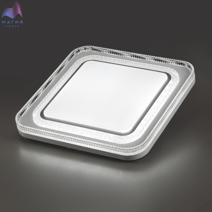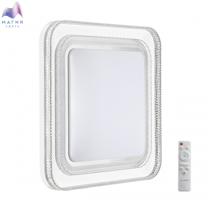 Светильник 7685/EL серии Сонекс Sгян silver состоит из металлического основания и пластикового рассеивателя. Основание декорировано двойным прозрачным ободом "под хрусталь" из пластика прозрачного цвета. Обод украшен пластиковым кантом, цвет серебро. Степень защиты IP43 позволяет использовать светильник в определенных зонах влажных помещений. В комплект входит заменяемый LED модуль с линзами, мощностью 70 Вт, которая соответствует лампе накаливания 610 Вт. А также пульт ДУ, с помощью которого осуществляется плавное изменение цветовой температуры 3000-6000К, изменение яркости, переход в режим переключения теплого/белого/холодного/ночного света. Светильник имеет функцию "память".