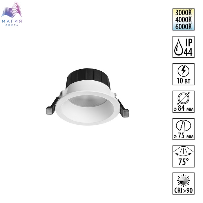 Встраиваемые светодиодные влагозащищённые (IP44) светильники Novotech CLARA с возможностью выбора цветовой температуры — тёплый белый (3000K), нейтральный белый (4000K) и холодный белый (6000K). Доступны в популярных вариантах цвета корпуса: матовый чёрный и матовый белый.
